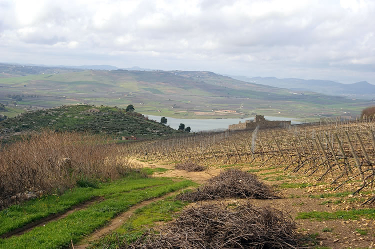 Vineyards in Sicily. These belong to Planeta, and in the foreground are vine prunings. Photo taken February 2009.
