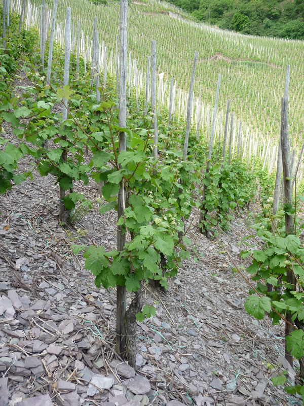 staked; soils are slate; the vines are ungrafted and very old. Taken May 2009.