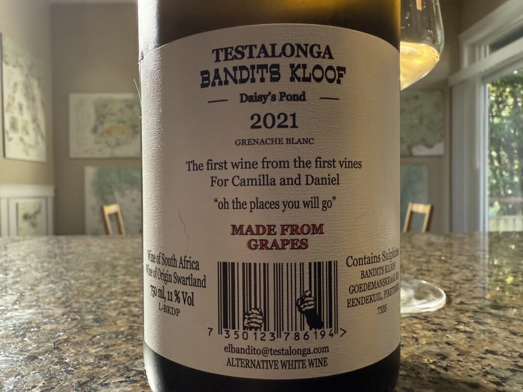One of the stars of South Africa’s New Wave wine renaissance, Testalonga is Craig and Carla Hawkins’ personal project, dedicated to experimental wines and rescued grapes, often from old vineyards. They were the first of the Swartland Revolution collective to start their own vineyard project, back in 2015, when they moved to a farm in the northern reaches of the Swartland, nestled into the Olifantsberg mountain, called Bandits Kloof (Goode and I visited them on the farm in 2019). This is the first release from the vines they planted there in 2018, an organic Grenache Blanc from head pruned (high bush vines) young vines in decomposed sandstone and shale, at 380m. It was whole bunch pressed into 2 old 400L French barrels, where it took a full year to complete MLF. In all, it remained on full lees 21 months before racking the day prior to bottling, unfined and unfiltered. A waxy sheen underlay supports crystalline quince, verbena, meadow grass, elderflower, pine nut, and brightly shining lemon pith and peel that linger on the stony, saline finish. Ample tangy acidity and youthful energy in this slight (11.11%) white, which needs time in the glass to open and unfurl itself. 92/100