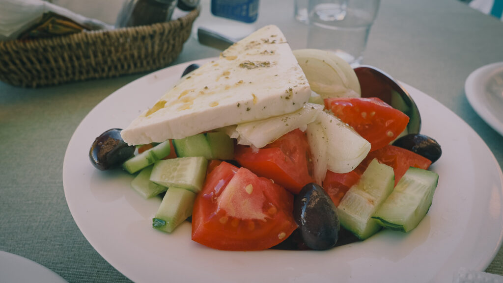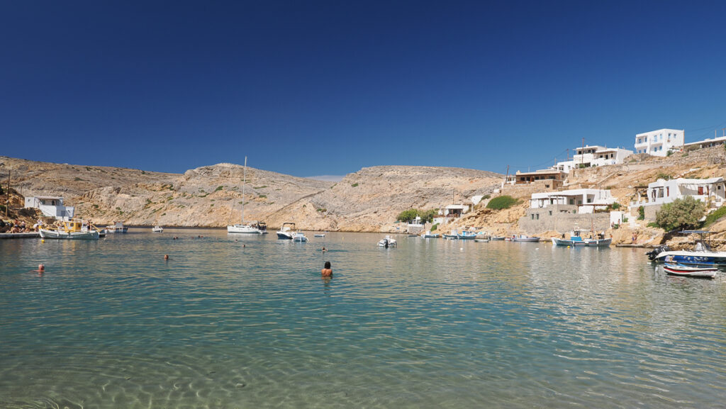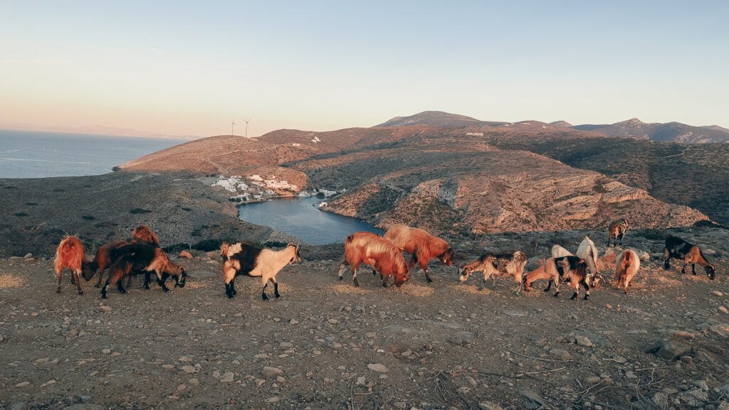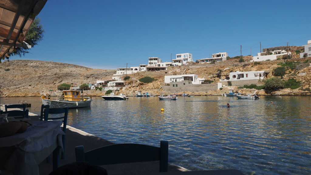 Cheronisoss (also referred to as Heronissos) was a great place to begin the trip. It’s a small village right at the top of the island, based around a stunning secluded bay. We checked into our accommodation and headed straight down for lunch at Fish Tavern Fyssas, one of the two options on the bay. It’s a fish-focused taverna, nothing fancy, but solidly good. Unless you get there early, you just wait for a table to become available, and as with any of the decent places on the island with no booking policy, getting there early is the best option, just after noon, when you get the pick of the tables.