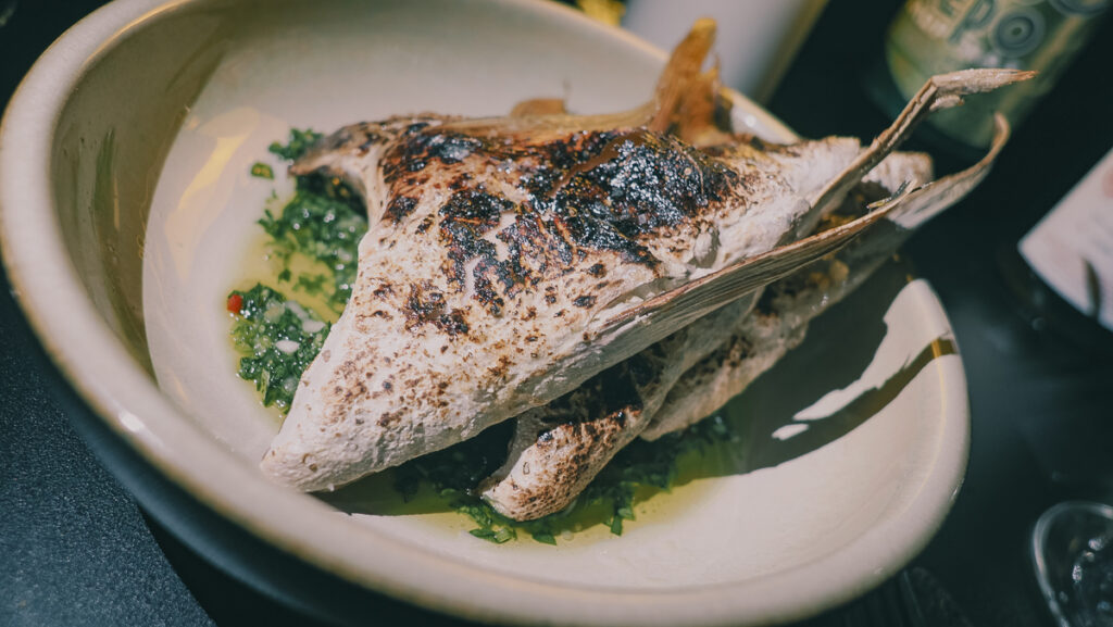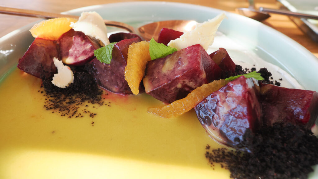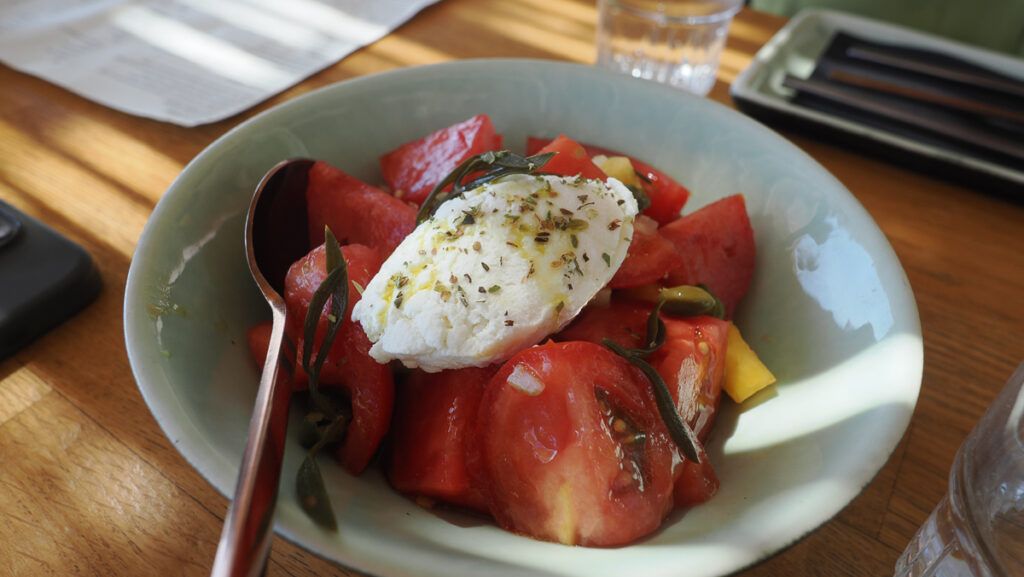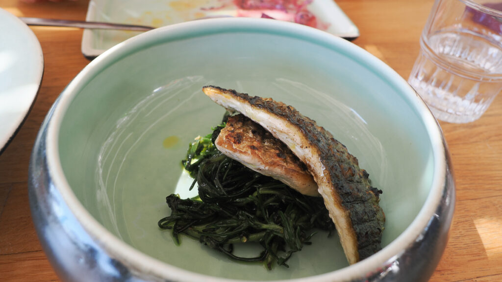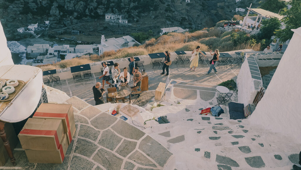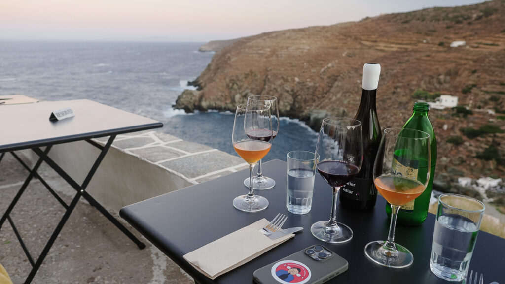 Now this is a location: each evening, just before 7 pm, the tables are set up alongside the walls looking down to the sea through a small canyon. Facing where the sun is about to set. Everyone wants to be here for the golden hour, and a queue was already forming even before the set-up was finished. Fortunately we had an in (we’d met co-owner Noda in Pharoah, Athens a few nights before), and snagged one of the coveted tables, where we dined flanked by influencers looking to get that perfect shot of them sipping orange wine with the backdrop of the setting sun. You need to book for Loggia, unless you are arriving after sundown.