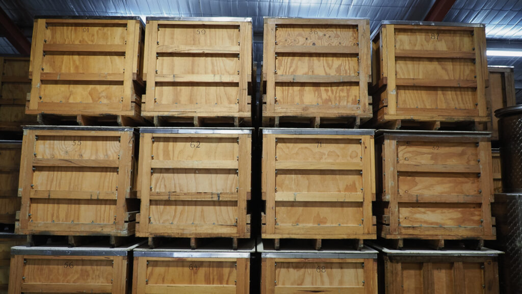 I visited with winemaker Sarah Crowe on a gorgeous early summer day. We spent some time in the vineyard, had a look round the vineyard, and then had a look around the winery. The tea chest fermenters devised by Bailey are still used today for the reds, and they are hand-plunged twice a day during fermentation.