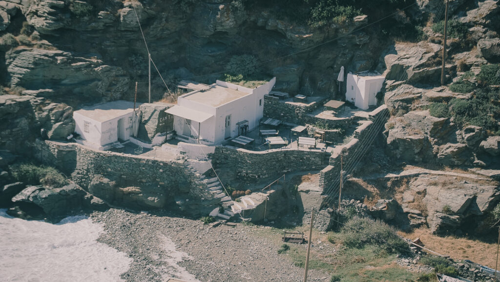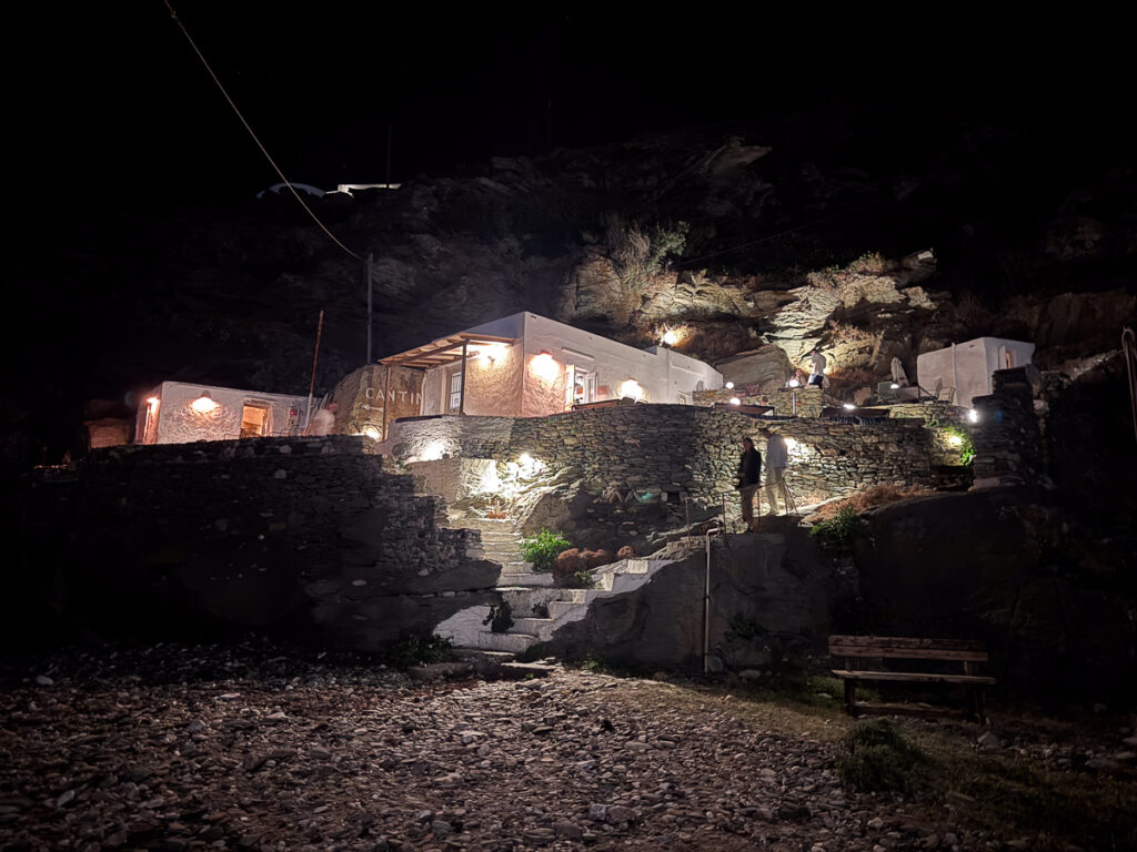 You can see it from Loggia: looking down from the top of Kastro there’s a small stony beach (Seralia), and right up close to the waterfront, almost hewn into the rock, is a rustic building with a small courtyard which by night turns into a serious tasting menu restaurant.