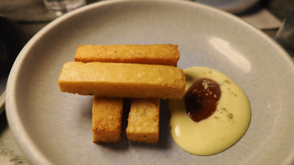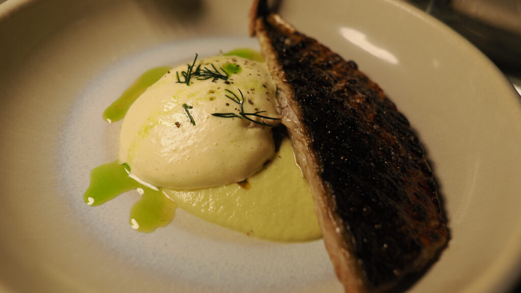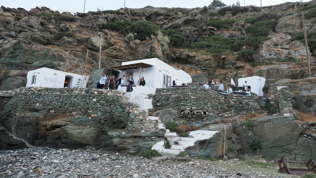 There are three services: 4 pm, 7 pm, 10 pm. You can’t eat at any other time. It’s tasting menu only at 70 Euros, although there’s the option of a slightly expanded version at 100 Euros. This is another place you need to book for, and we were quite lucky to get in for the 7 pm service. A few minutes before 7 we mingle on the shingle, before the group is invited to come up. It’s a remote setting with no car access: we walked down from Kastro and then along a bamboo-lined path in the gorge to the tiny bay.