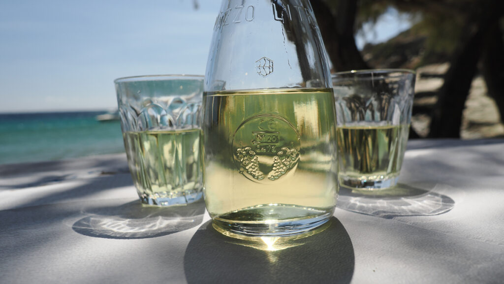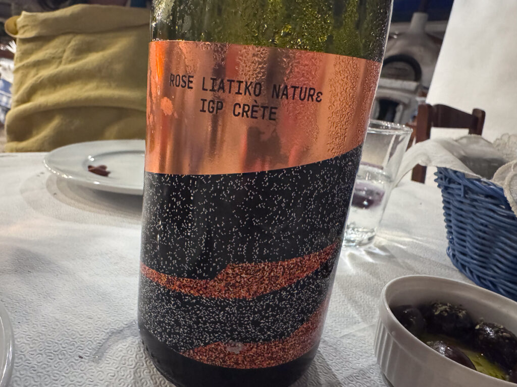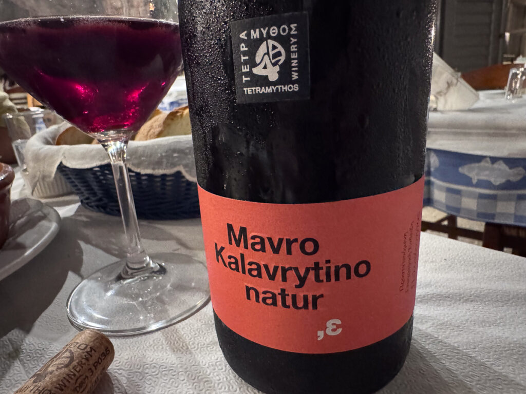 There we found a taverna right on the waterfront and snagged a prime table. This is the Chrysopigi tavern, and it turned out to be an excellent restaurant, and the food was spot on. We had a look at the bottled wine list, but nothing jumped out so we had the absurdly cheap and perfectly good house white.
