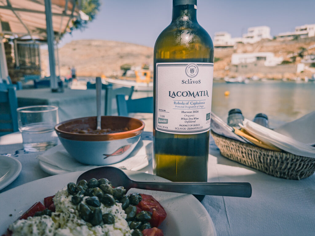 So the final day. We weren’t catching the ferry until 5 pm, so it was back to Cherinissos for the magical bay and the fish tavern. Lots of swimming, and a brilliant lunch: this time we drank a bottle of the amazing Sclavos white that I’d bought at Mr Vertigo at the beginning of the trip. It was gorgeous in this setting. What a beautiful few days.