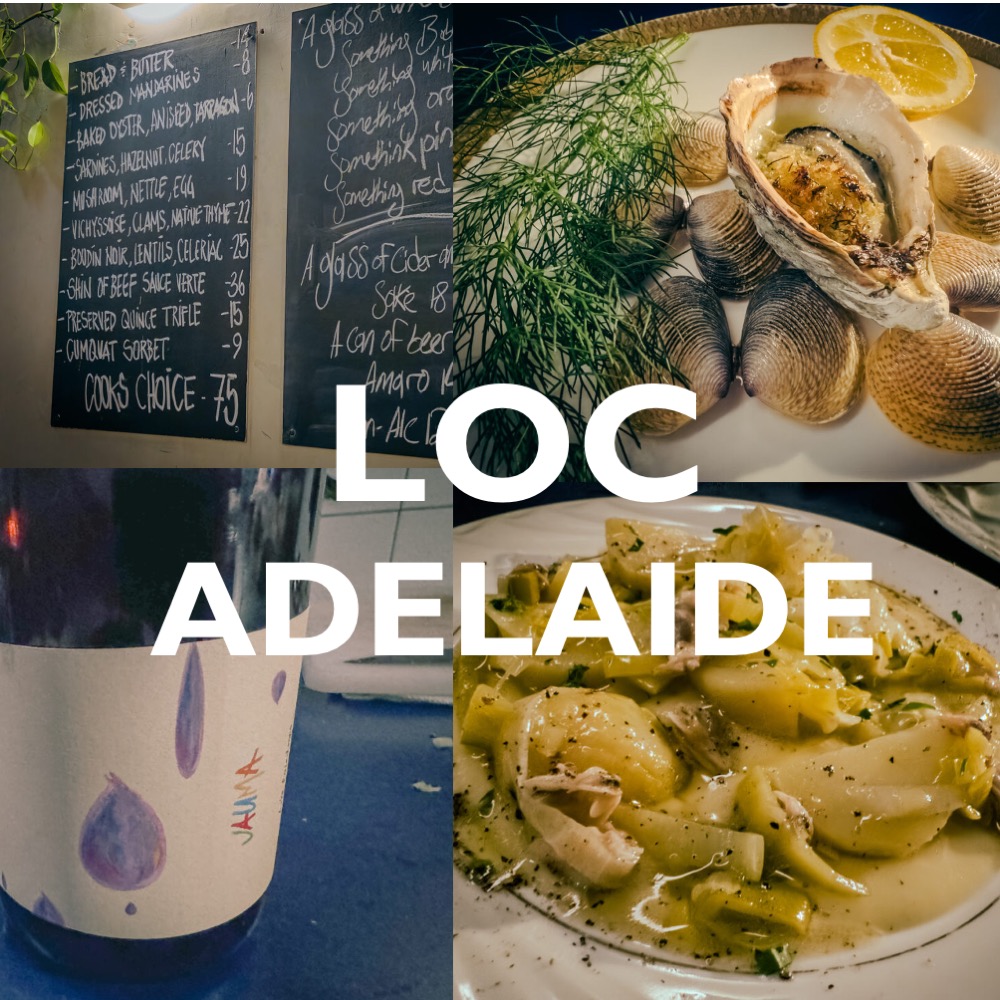 So informal, so beautifully done, so intimate. An ever changing rotation of chefs and small plates, with a fully natural wine list. I solo-dined here in August and loved it. Just eat what you are given. https://locdotcom.au/ My review: https://wineanorak.com/2025/08/02/restaurants-loc-adelaide-a-small-but-perfectly-formed-natural-wine-bar-and-restaurant/