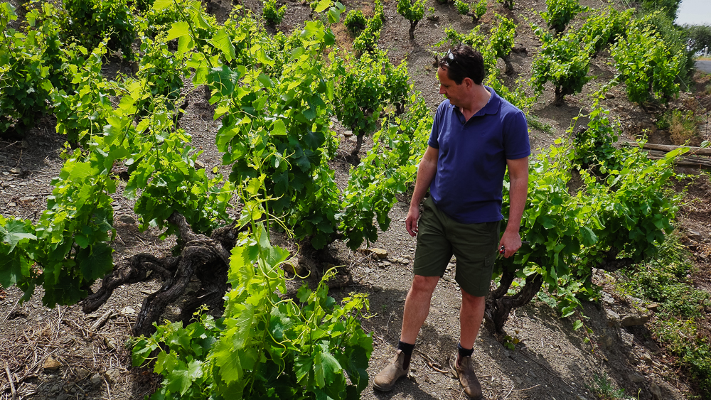 We’re in Maury. It’s beautiful and rugged, and the vineyards are rocky. I’m with Richard Case, who makes wines for his own domaine (Pertuisane) and also for Dave Phinney’s Department 66.