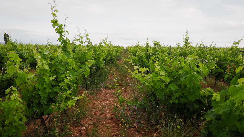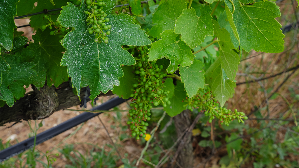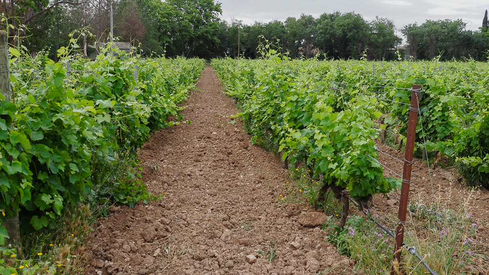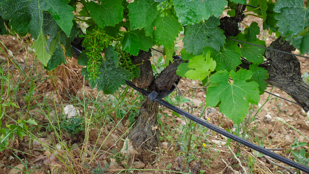 Now, 33 hectares on the estate out of 53 hectares have irrigation. At one site there is a canal, and at another there is a well, so water is available. The goal is to give the vines 25 mm per month at the right moment, in May, June, July and August. This is not a lot – 100 mm – but it avoids too much hydric stress.