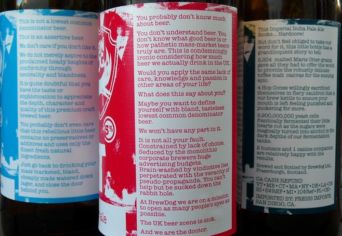 As for BrewDog, they’ve done an impressive job of getting themselves into the mainstream while making interesting beers. They’ve done it by intentionally saying ‘controversial’ (annoying) things to get into the news, instead of paying for advertising. They’ve also got themselves engaged with beer bloggers – savvy. But the way they slag off ‘substandard’ alternatives is already tiresome – imagine the top wineries printing that kind of stuff on their labels? Suspect it’d be a turn-off for wine geeks/critics.