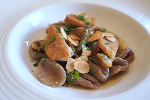 Buckwheat orecchiette with veal cheek, sweetbreads and almonds