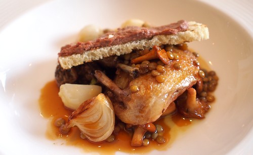 Roast pigeon with cepe duxelle, umbrian lentils, liver crostini and balsamico