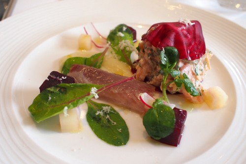 Wild sea trout rillettes with smoked eel, apple, beetroot and horseradish