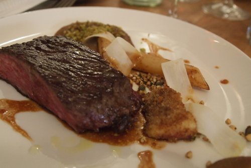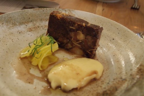 Had lunch today with Marimar Torres and her daughter Cristina at Arbutus, in Soho. It was my first visit to Arbutus, and I loved the food, although the dining room is noisy and quite basic. The food is serious, and much better than the environment. I had warm, crisp pig’s head with potato puree and pickled turnip (which was great, although the turnip had a slightly musty taint), followed by a grilled piece of beef, salsify and bone marrow gratin (just perfect).