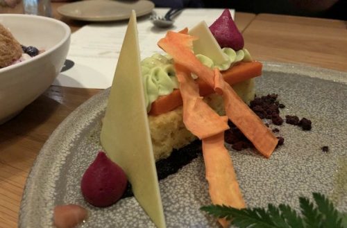 Its innovative nature is probable best summed up by one of the desserts we had, which was entirely constructed from vegetables (pictured below). The wine list here is exclusively from BC (British Columbia, the Canadian province we are in, which has the Okanagan and Similkameen Valleys as its main wine regions), and we had some nice bottles: