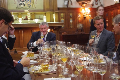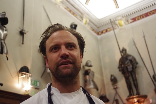 Today was the launch of the Pol Roger Blanc de Blancs 2002, held at the fantastic Armourers’ Hall in the City of London. Aside from the fact that we were tasting 7 vintages of this brilliantly consistent, pure and complex Champagne, one of the draws was that Pol Roger had lured star chef Brett Graham (below) out of his kitchen at the Ledbury to cook for us.