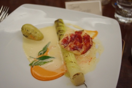 First course was lobster with grilled leeks and Champagne. This was quite subtle but delicious, and was paired with the Blanc de Blancs 2002 and 1998.