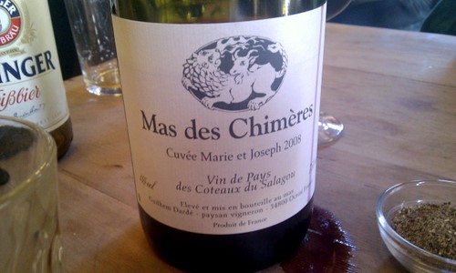 To drink? A brilliantly delicious, spicy, peppery, savoury Languedoc red – Mas des Chimeres Cuvee Marie et Joseph 2008, a vin de pays du Coteaux du Salagon. There’s fruit here (this is a varietal carignan), but it’s not an overly fruity wine, and the spicy bite makes it a hugely drinkable food companion. Guilhem Darde makes a range of wines (see the Mas des Chimeres website) and on the basis of this bottle, I think I have to check them out.