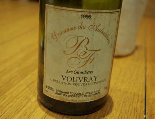 Now I am relaxing with the help of Vouray. It’s the remains of a bottle of Domaine des Aubuisieres ‘Les Giradieres 1er Trie’ 1996, which I bought back in 1999 (I think) from Oddbins, for around £13. I opened it on Tuesday for house guest Illka, but we had quite a few bottles open, so this didn’t get finished.