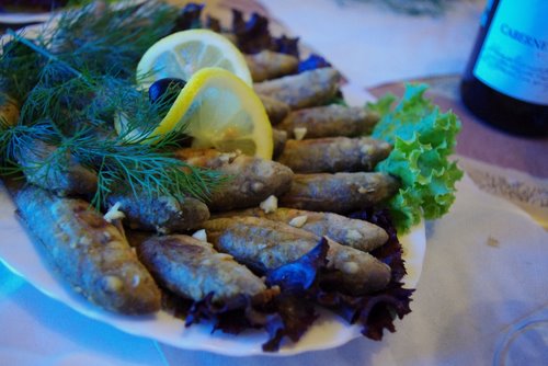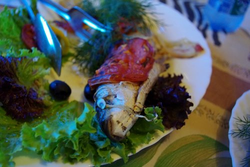 Above, we have a fish called sultanka, which is deep fried; below is cephal, which is grey mullet.