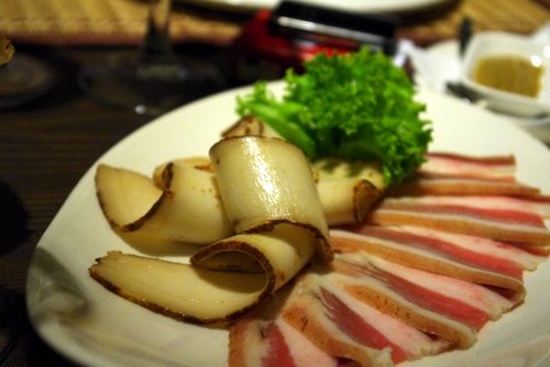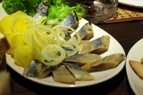 Some food notes. Above, herring, onion and potato; below, sala, which is pork fat. Both are great with vodka.