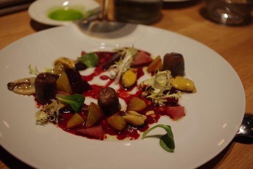 This was a creative, visual, unusual dish. Mussels with pigs tail and a variety of beetroots.