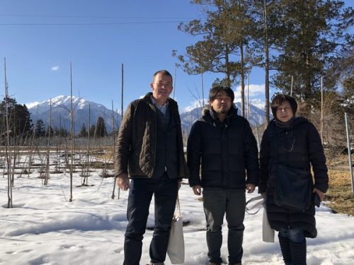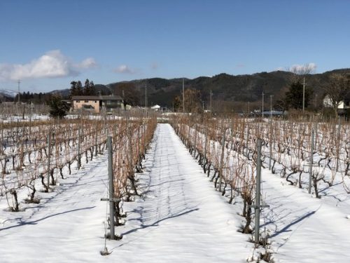 I head to Omachi, in the north of Nagano Prefecture, in the Nihon Alps wine region. It’s decidedly alpine here, and we’re fringed by mountains, and the vineyard is covered by a blanket of snow. I’m here to visit Masaki Wakabayashi, who established his small winery, Northern Alps Vineyards, back in 2008.