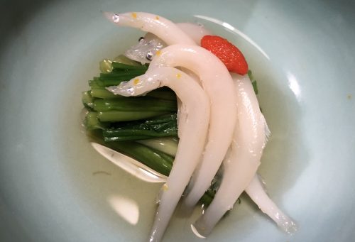 Boiled Japanese parsley with small white fish and Yuzu powder