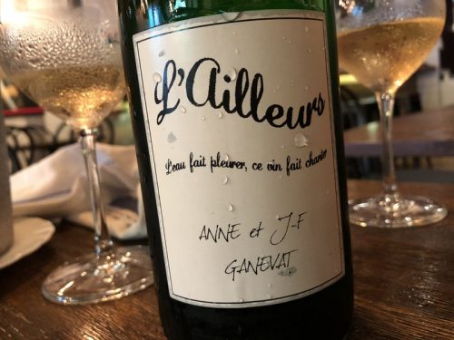 Then we opt for Ganevat, and the L’Ailleurs cuvée. It’s quite exciting to find this wine: a blend of Alsace Riesling and Jura Savagnin, hence it’s Vin de France and NV. There’s a beautiful toastiness to the nose, with some sweet citrus notes, and in the mouth it has volume and also precision. Beguiling and really complex, with the faint ghost of reduction.