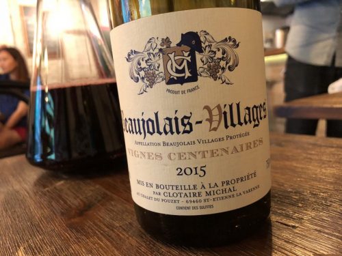But there’s still time before dinner for another bottle. Beaujolais seems a good bet, and we are steered towards the 2015 vintage of Beaujolais Villages Vignes Centenaires from Clotaire Michal (even though I’m not a massive fan of this vintage in the region: it was just a bit too warm and dry). Lo and behold and the wine is big and dense, almost northern-Rhône in style, with intense, slightly stinky black cherry and blackberry fruit. We are encouraged to decant it: it needs it. This is a little reductive and also a little bretty, but it’s strangely compelling, with the volume knob cranked up, but still it sings a good tune.