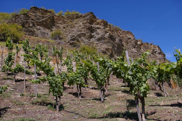 It’s a small block of Riesling at Gibbston Valley, Central Otago. On schist – very mosel like, but I guess also a bit Cote Rotie like, too. Syrah and Riesling are the two varieties that I’ve seen grown most often on poles like this before.