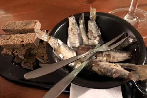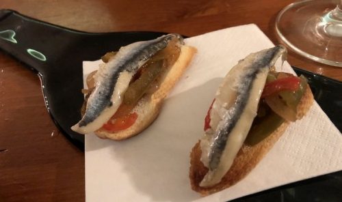 Then we chose a bottle off the list. It was from the Azores, and it was excellent. We had it with some small snacks: anchovies and sardines. This was a happy place.