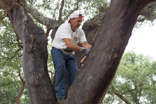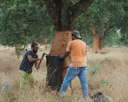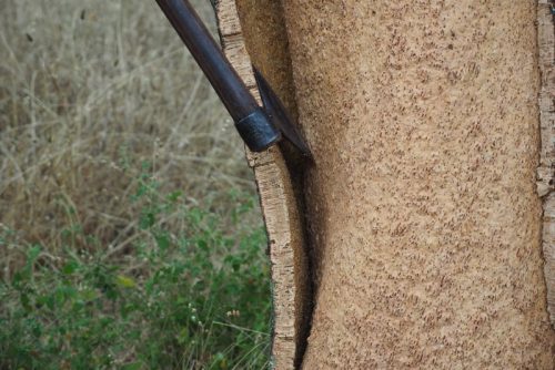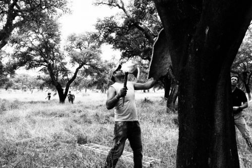 Harvesting the cork is a skilled job. The strippers are paid well, and the job is typically passed down along a family line. They have just one tool: an axe with a slightly curved blade. They have to make cuts along a line, and then use the head of the axe to prise the bark off without splitting or damaging it.