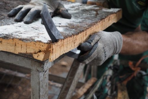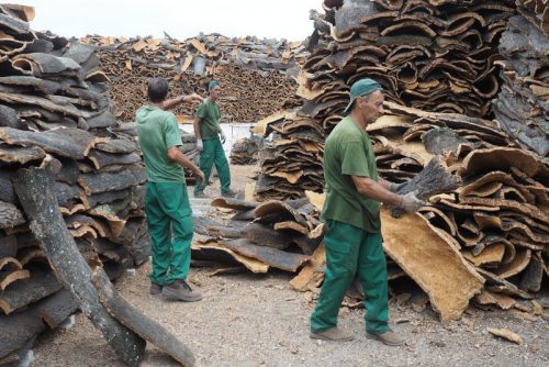 Finally, the boiled planks are inspected and cut into smaller pieces, with any major impurities being removed. This is also a final sorting stage. The pieces suitable for punching corks are then bundled back on pallets and sent up to the north to the cork factory.