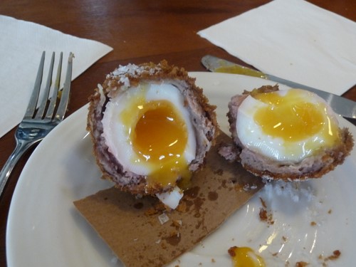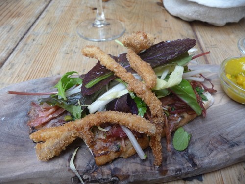 Joe was late, so while we were waiting for him, we started with a pint of Wandle from Sambrooks brewery in London, accompanied by one of the Harwood’s specialities, a venison scotch egg. This was fantastic. Joe still hadn’t arrived, so we ordered for him.