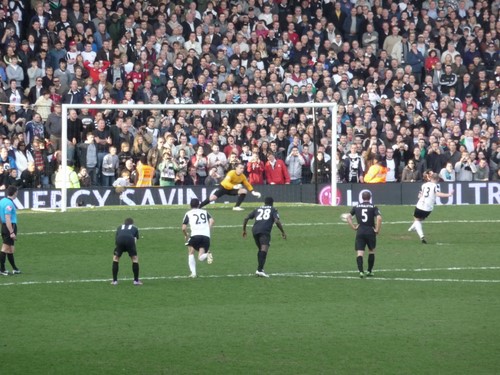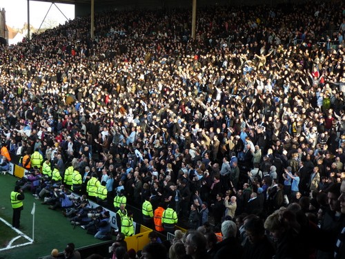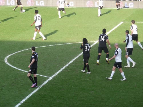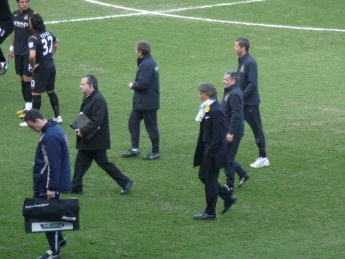 Fulham didn’t threaten much, and shortly after, City were two up, after a very neat interchange between Bellamy and Tevez. It stayed that way until the 70th minute, when Fulham had a slightly lucky break and were awarded a penalty, which Murphy despatched. This left a nervy close to the game. At one stage it looked as if Fulham had equalized: everyone rose cheering, but we couldn’t see from where we were sitting that the Fulham striker (who had just come on as a sub) had missed what seemed a relatively easy chance.