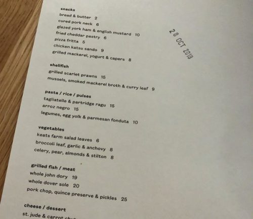 We eat and drink well. The menu is short and perfectly formed. First, some wine. The wine list is quite brilliant. It’s natural-heavy, but perhaps best described as lo fi, with a lovely selection of authentic wines, not just the same old natural names. [This is perhaps the only hitch of the night: the staff don’t seem to know the wine list perhaps as well as they should.] We order the Sébastien Riffault Skeveldra 2012.