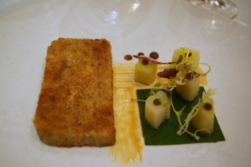 The lunch was also fantastic. We began with a warm terrine of chicken and foie gras that was a great combination of textures and flavours, served with some mini-leeks. Superb with the Sorrenberg Chardonnay.