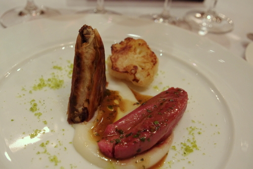 Changing flavours quite dramatically, we then went to the wood pigeon (cooked sous vide), roast cauliflower and pastilla. A very interesting, richly flavoured dish that worked very well with Castagna’s Un Segreto, although the Cambridge Road Syrah also worked nicely.
