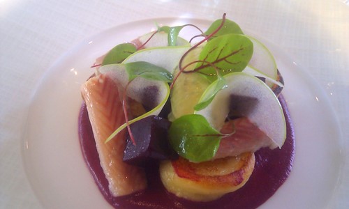 The food? Just brilliant. My starter (top picture, pls excuse the dodgy phone camera quality) was smoked eel with marinated beetroot, horseradish and potato pancakes, and was perfectly judged. Fiona opted for seabass sashimi with wasabi mayonaisse, shrimp beignet and guacamole, which was full of interesting flavours and textures.