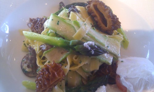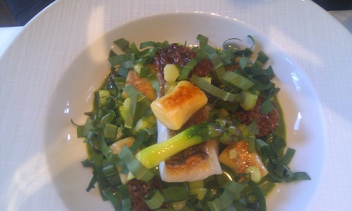 It was a bright spring afternoon, so it’s nice to have food matching the season. I followed up with a very fresh tagliatelle with forest mushrooms, asparagus and a poached egg (above). It was really good, but Fiona’s choice – roast pollock with wild garlic veloute, gnocchi, asparagus and morels was close to perfection (below).