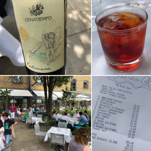 On the hottest day of the year, my first visit to the River Café. I know: it’s almost inexcusable not to have been before. This is a London institution. Originally opened in 1987, it’s located by the river in Hammersmith, and on a hot day the dappled sunlight of the outdoor seating area is just perfect.