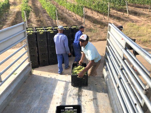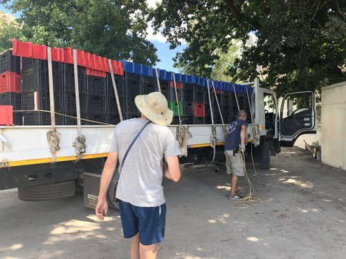 Once again, these were packed in kissies. The alternative is to use half-ton bins, but the grapes would need to be processed as soon as they got back to the winery because the bunches at the bottom would be crushed by the weight of the grapes above. The benefit of kissies is that they keep the fruit in optimum condition, and you can put them in a cold room for a day or two before processing. They are just a lot of work to move around and then clean after use.