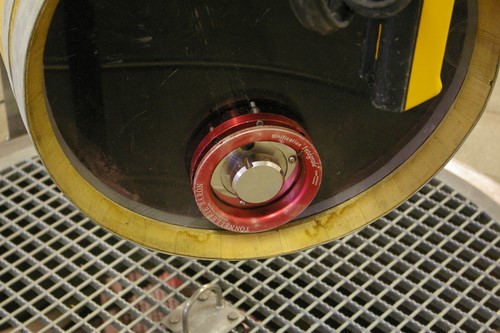 One of the heads of the barrel is replaced by perspex, and a metal device is inserted into it. This contains a valve which releases carbon dioxide during the fermentation, as well as a means for stirring up the grape mass.