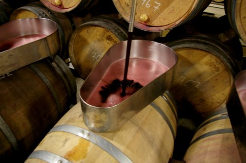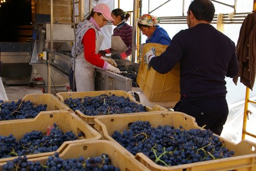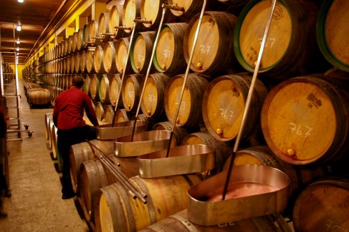 The pictures. Top, inside a basket press. Below this is the view of the vineyards over the roof of the Allende winery in Briones. Then some harvesting of high-end grapes at Allende – this is probably going to be Aureus. Directly above and bottom, racking the barrels at La Rioja Alta. There are 43 000 of them – and they are racked by gravity into a clean barrel. Below: grapes at Allende. Looking good.