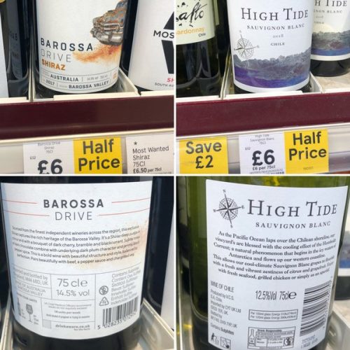 There were two products on shelf. One was a Central Valley Sauvignon Blanc from Chile, made by the Concha y Toro group and bottled at Greencroft. High Tide is actually an Isla Negra brand, but this isn’t an Isla Negra wine according to the label. It’s not a £12 wine. The second is the Barossa Drive Shiraz, which is a soft brand exclusive to Tesco and bottled by Kingsland. Again, this is not a £12 wine in terms of value. I haven’t tried either so I can’t comment further, other than to say that I hope this isn’t the beginning of the resurgence of the fake half-price wine deals.