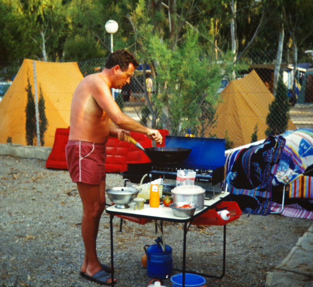 Camping. Dad loved holidays. In fact, I think this was probably one of the things that led him to become self-employed. When Anne and I were age four, Hester 2 and Arthur fresh out, my parents began camping abroad for their summer holidays. They started off in France, on the west coast, but after a couple of wash-outs, realized that to get guaranteed sun, it had to be the Mediterranean coast. A campsite in Cavalaire, near St Tropez, became a favourite. Then Camping Marius, near Tarragona. Then they found what was to become their go-to – a site on the coast just above Valencia. So many memories, not least of the epic two or three day journeys to get there and back, with four kids sitting in the back seat. [As I grew taller I bagged the front seat, and mum moved back, in part to break up the inevitable fights.] Dad seemed very happy on holiday, soaking up the sun on the beach, drinking cheap wine (and the famous sundowners my parents enjoyed before dinner, long drinks taken out of tall ceramic glasses), and then cooking for the family. He loved his tents: we had all the tents. From frame tents, to trailer tents, to smaller tents for shorter camping trips to Cornwall, to a couple of Toyota Hiace motor caravans. After we kids flew the next, mum and dad took to Caravans for their regular forays to France and Spain. I think I get my love of being on the road from Dad. A wanderer.
