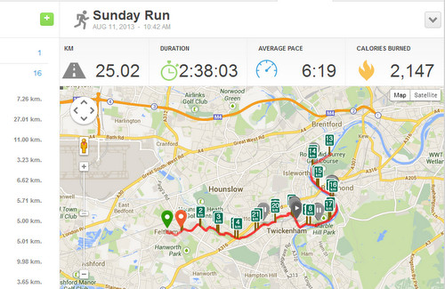 Runkeeper tells me that my first 10 k was on June 9th. I had to walk bits, but it felt like an achievement. I repeated this distance on the 12th, 15th and 19th, and then in July on 2nd, 7th, 9th, did a couple of runs in the heat and humidity in Canada, then another 10k on 22nd, followed by my first 15 k on July 27th. I was now getting ready to try some bigger runs, and each time I pushed it a little further, I felt an immense sense of achievement. On August 4th I did my first 20 k, then on 11th I did 25 k, on 25th did 22 k and on 28th did 27 k. This week I am taking it easy in anticipation of running an absurdly long distance on Saturday.