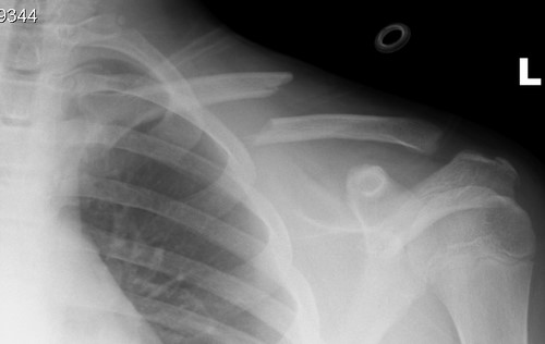 Spent the morning in Kingston Hospital with older son. Last Saturday he broke his collarbone playing rugby, down in Somerset at school. So he’s been home all week, and this morning I took him in for his fracture clinic appointment. In typical fashion we weren’t seen until an hour after our appointment time, and they couldn’t locate his X-ray, so he had to have another (above). It shows that there’s a bit of a problem: that clavicle is well and truly broken. They are going to see whether the bone knits back together; otherwise an operation may be in order.