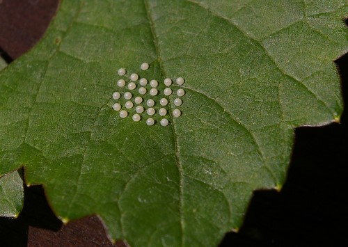 …this intricate array of eggs. Not being an entomologist, I haven’t got the ability to identify them. They’re incredibly beautiful, but I removed the leaf just in case the little hatchlings eat my vines.